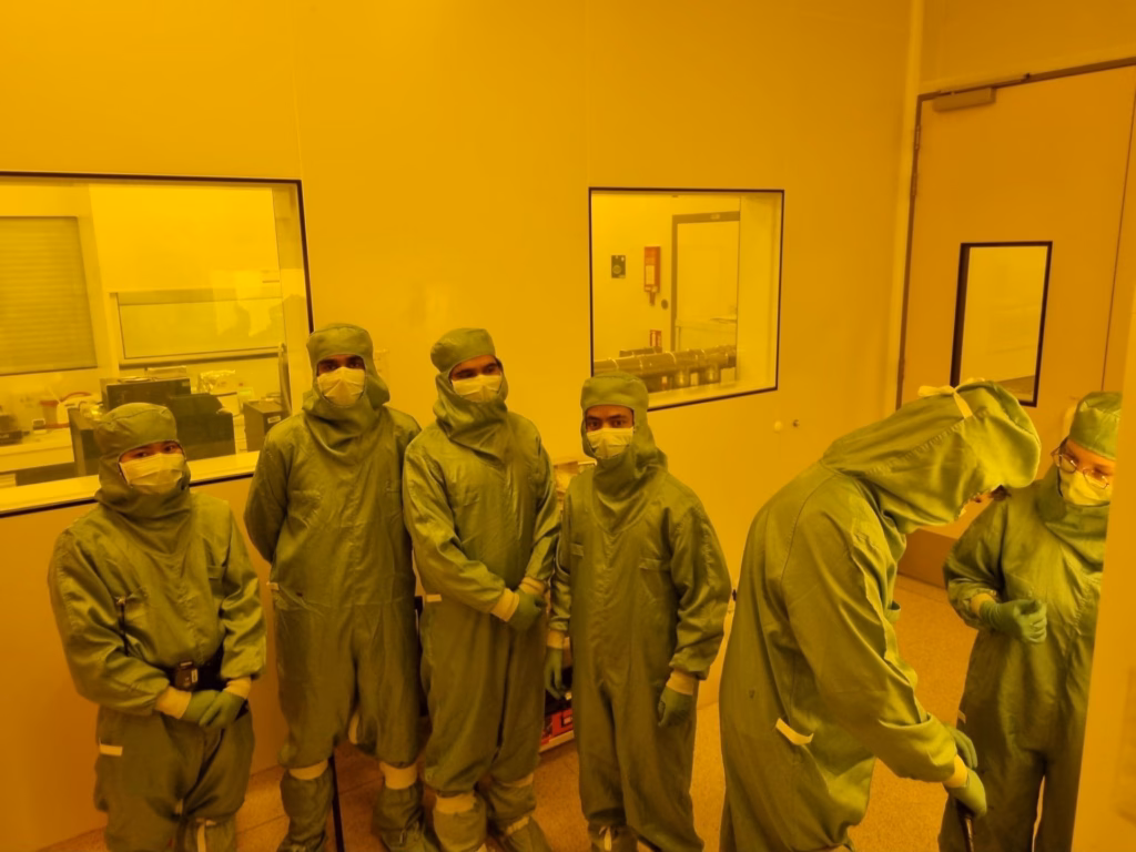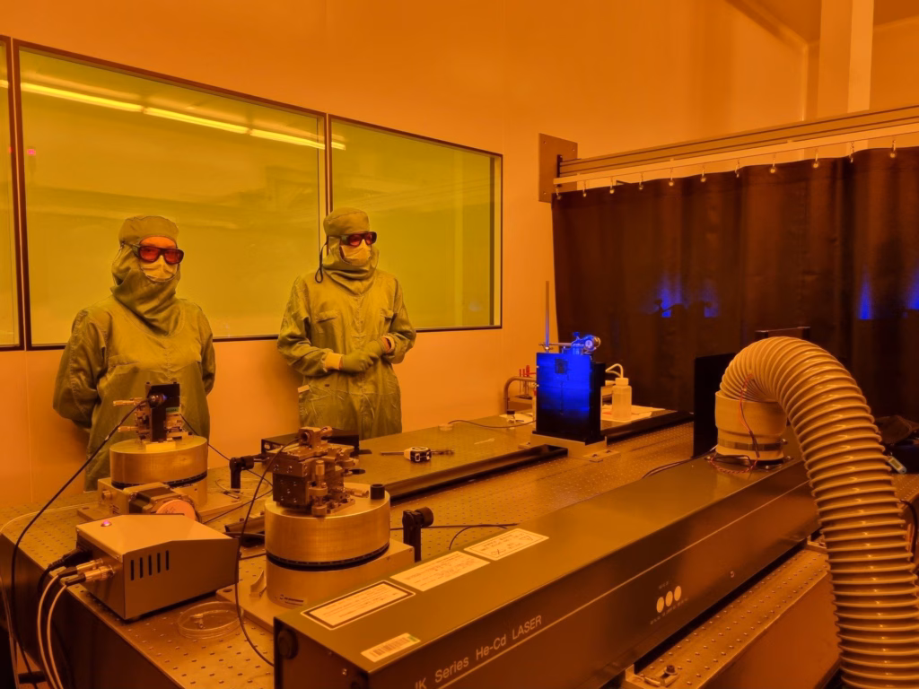 The master 2 PSRS students present at UJM inaugurated the first practical session carried out on the NanoSaint-Etienne platform yesterday. They worked in a clean room under an inactinic light to clean a sample, deposit a thin layer of photosensitive resist by spin coating, use an interferometric setup to illuminate the sample, develop the resist and get a surface grating, which they characterized with an atomic force microscope.