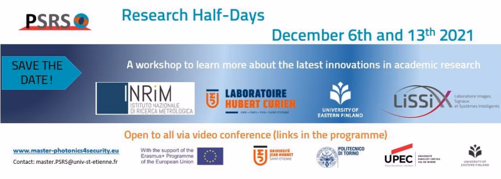 We are organising the PSRS Research Half days on December 6th and 13th. Join us to discover the latest innovation in Reseach in four different research centers: the Istituto Nazionale per la Ricerca Metrologica in Torino, Laboratoire Hubert Curien in Saint Etienne, University of Eastern Finland in Joensuu and the Laboratoire Images, Signaux et Systèmes Intelligents in Paris.